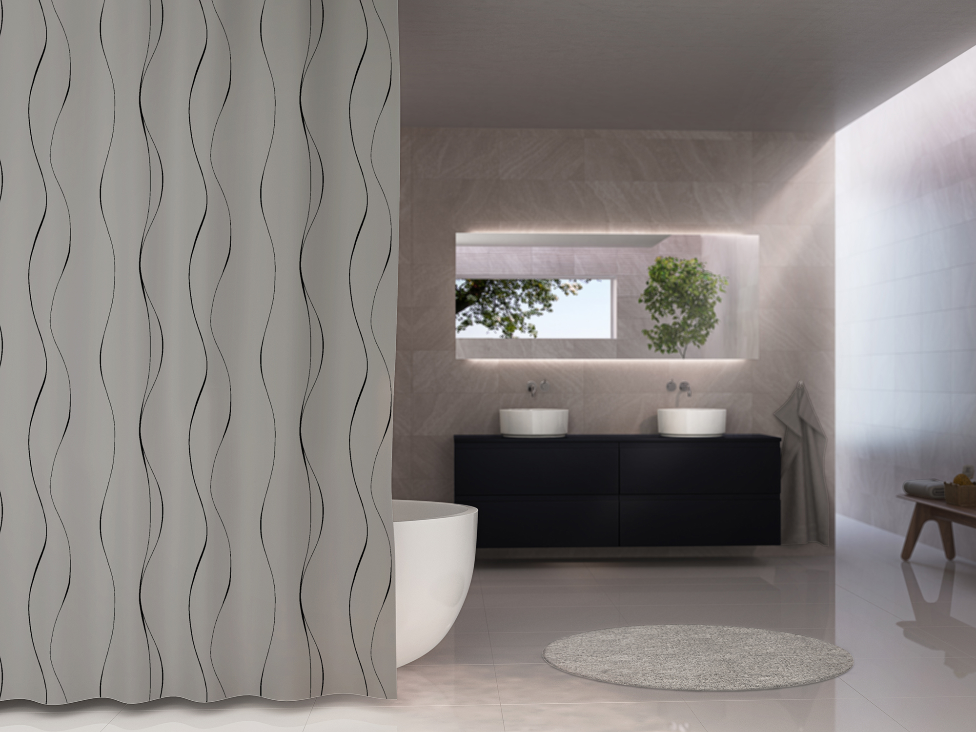 Body badeforhænget fås i to farver – hvid og grå. Det er et meget enkelt forhæng med fine, sorte streger, der kan ligne konturen på en krop. Deraf navnet, Body.