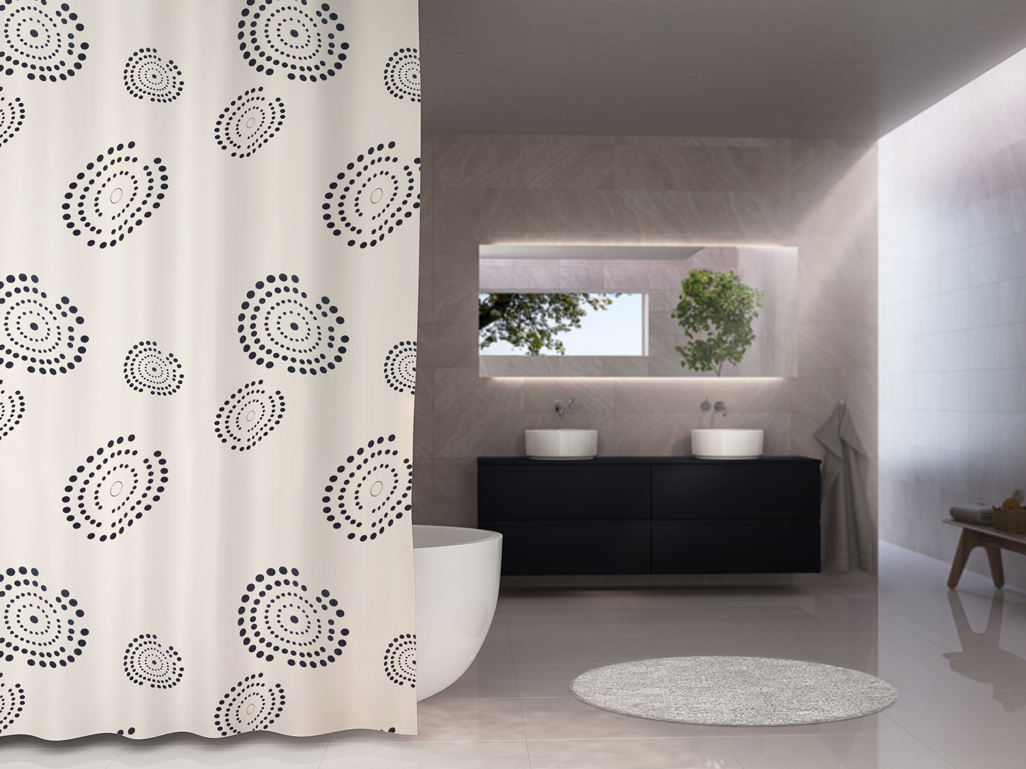 Circle passer perfekt ind på badeværelse, hvor der ønskes et mere roligt og grafisk udtryk. Forhænget fås i størrelsen 180 x 200 cm og er lavet med 12 metalkovsere foroven. Der medfølger ikke ringe, så husk at tilkøbe ringe og evt. vores fjederstang. Det kan købes samme sted, hvor du køber badeforhænget.