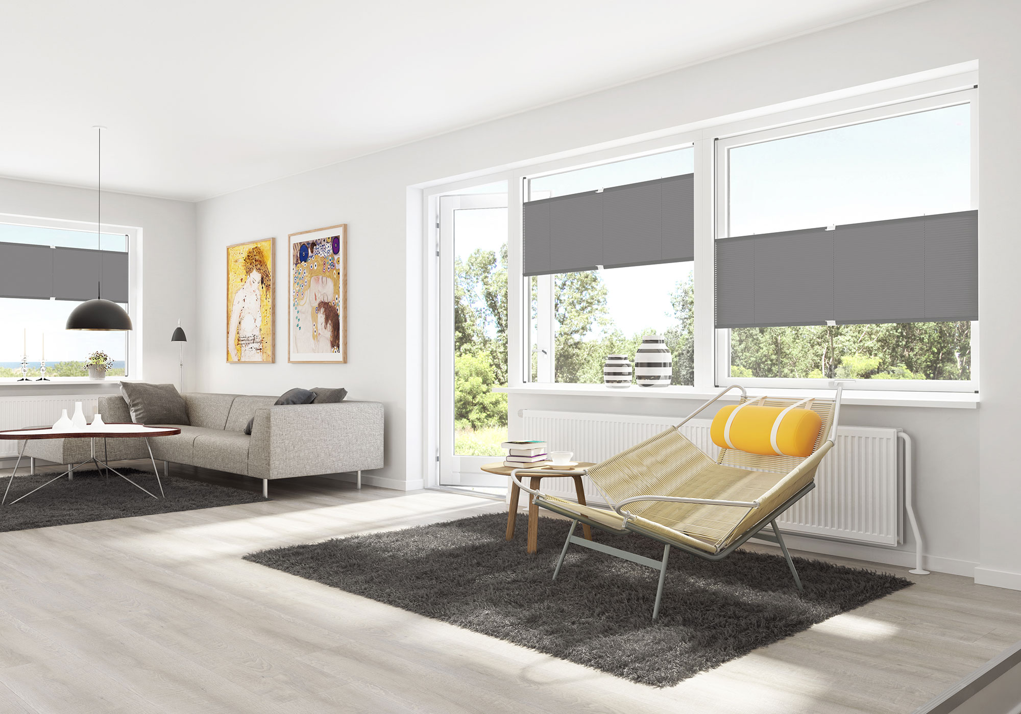 Flex er et ensfarvet plisségardin med greb – uden betjeningssnore. Plisségardinet betjenes let ved at trække i grebet på over- og underskinnen.
